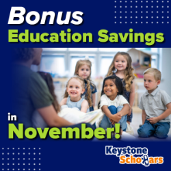 Families who claim their child’s $100 scholarship from Keystone Scholars in November and open and link their own companion PA 529 College and Career Savings Program account will get an additional $50. Taking this action in November results in initial education savings deposits of $150.