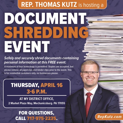 The second shred event will take place later that week and will be co-hosted with Sen. Greg Rothman (R-34) at our South Middleton district office and municipal building.