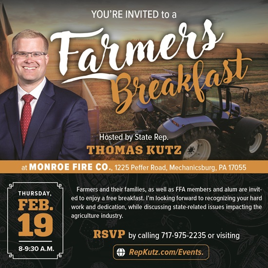 I would like to invite farmers, their families, and FFA members and alumni to attend a Farmers Breakfast on Thursday, Feb. 19, from 8-9:30 a.m. at Monroe Fire Company, 1225 Peffer Road in Mechanicsburg.