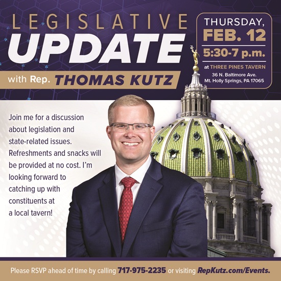 Please join me for a legislative update on Thursday, Feb. 12, from 5:30-7 p.m. at Three Pines Tavern, 36 N. Baltimore Ave. in Mt. Holly Springs.