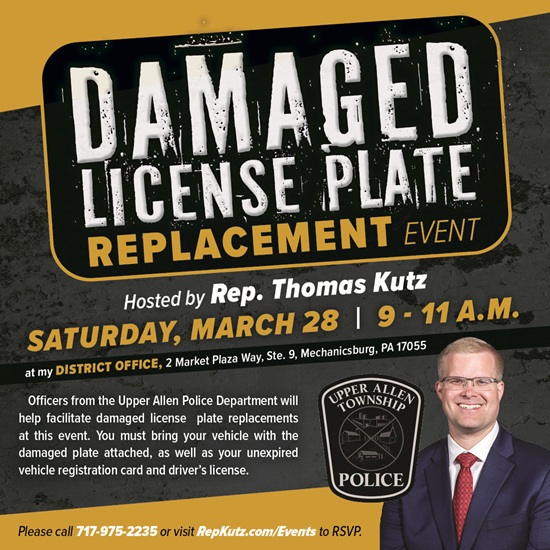 I will be hosting a Damaged License Plate Replacement Event on Saturday, March 28, from 9-11 a.m. at my district office, 2 Market Plaza Way, Ste. 9, in Mechanicsburg.