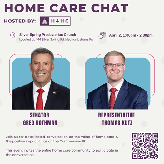 Join me and Sen. Greg Rothman for a “Home Care Chat” on April 2 at 1 p.m. at Silver Spring Presbyterian Church. We’ll be discussing the value of home care and the impact it has on families and communities across Pennsylvania.