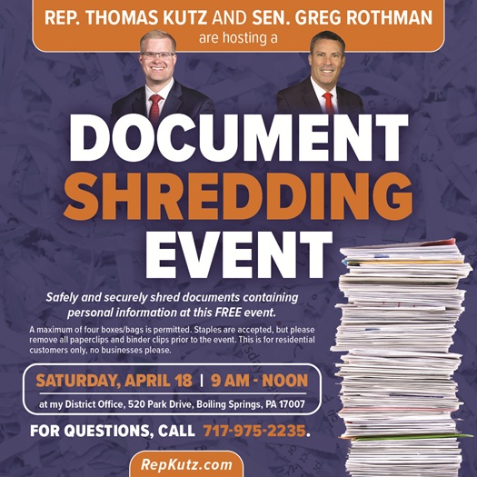 Sen. Greg Rothman and I will be hosting a free Document Shredding Event on Saturday, April 18, from 9 a.m. to noon at my district office, 520 Park Drive in Boiling Springs.