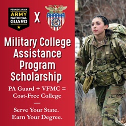 Available through a partnership with the Pennsylvania National Guard and Valley Forge Military College (VFMC), MCAP provides full tuition coverage for all four of a student’s undergraduate years in exchange for eight years of service with the National Guard. Students will receive a $420 monthly stipend as they complete their first two years of education at VFMC and then may transfer to another Pennsylvania school to continue receiving the MCAP tuition benefits.